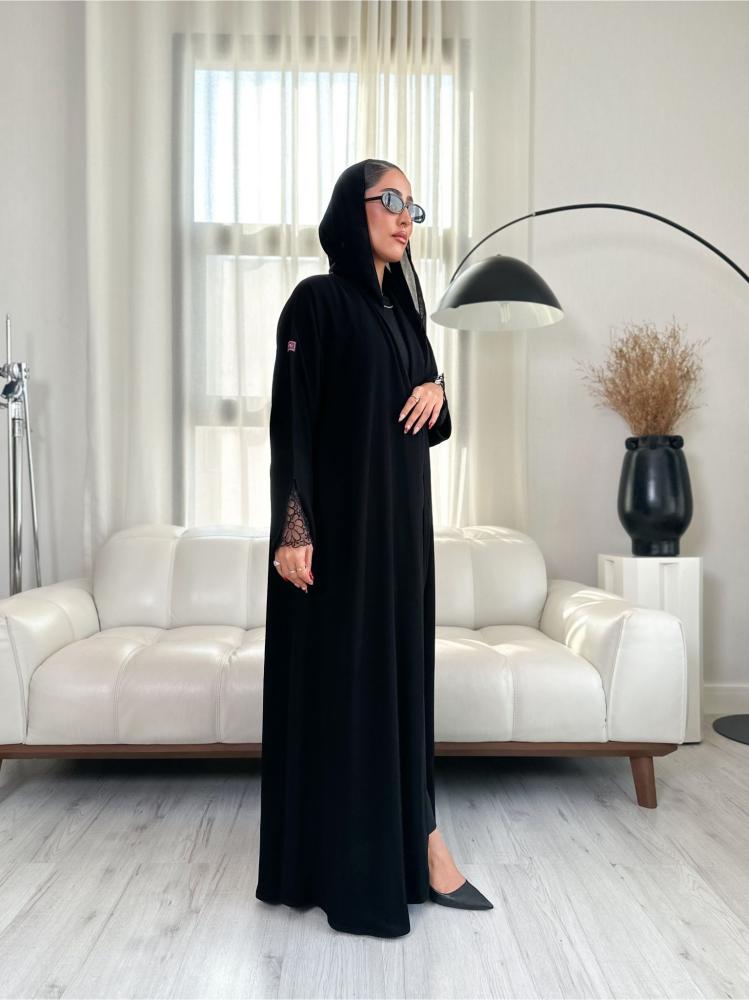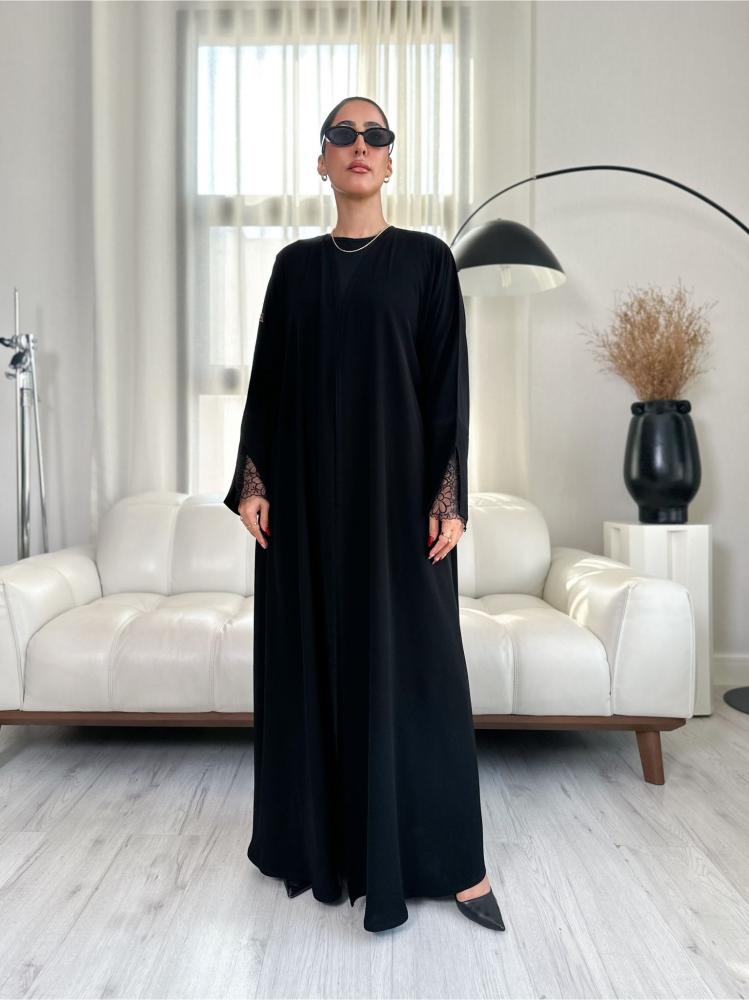 تألقي بإطلالة فاخرة وأنثوية مع عباية كلوش المصنوعة من كريب ملكي فاخر، الذي يتميز بنعومته وانسيابيته لإطلالة راقية ومريحة. يزين الأكمام لمسات من الدانتيل الفاخر على الأطراف، مما يضيف لمسة من الأنوثة والرقي، ليجعل هذه العباية خياراً مثالياً لكل امرأة تبحث عن التميز بأسلوب يجمع بين الفخامة والبساطة